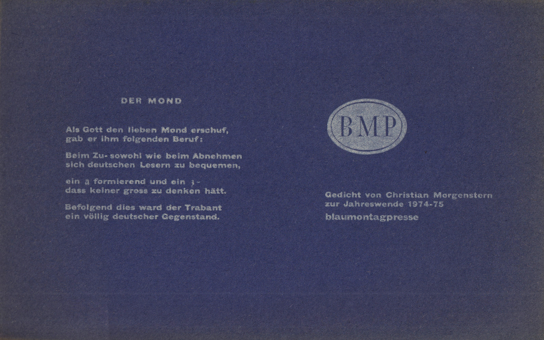 28. MORGENSTERN, Christian Der Mond. (Kleine poster). [Amsterdam], Blaumontagpresse, 1974. 17 x 27 cm. Plano. Eenzijdig gedrukt in geelwit op blauw stevig papier ‘zur Jahreswende 1974-75’.