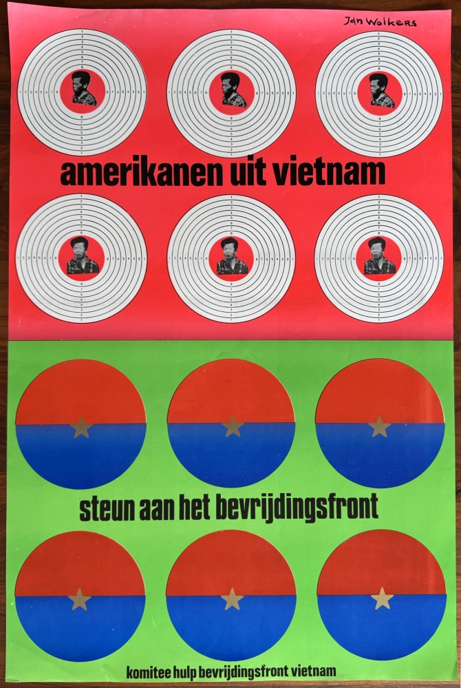 49. WOLKERS, Jan Amerikanen uit Vietnam. Steun aan het bevrijdingsfront. (Affiche). Zonder plaats, Komitee Hulp Bevrijdingsfront Vietnam, [1968]. 76 x 50 cm. Eenzijdig bedrukt in felrood en groen met blauw en zwart, in druk gesigneerd in de rechterbovenhoek. Mooi exemplaar.