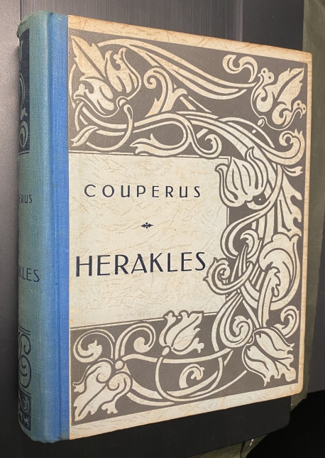 13. COUPERUS, Louis Herakles. Roman in twee deelen. Amsterdam, Veen, [1913]. Twee delen in één band. Halflinnen (‘behangband’). (4), 248, (4), 228 p. 1e druk. Goede band. Aardig literair exlibris van de leraar Spaans J.G. Blomkwist (1914-1993) met 13 schrijversportretten, onder wie Couperus en Multatuli, en voorzien van een degelijke boekenspreuk: ‘Lang gekozen en geschikt, blij vergaard en goed gebonden, vaak gewogen en gewikt, voor ’n aanwinst werd gevonden, maar de zorg hier aan gewijd, gaf ’n vreugde voor altijd’.