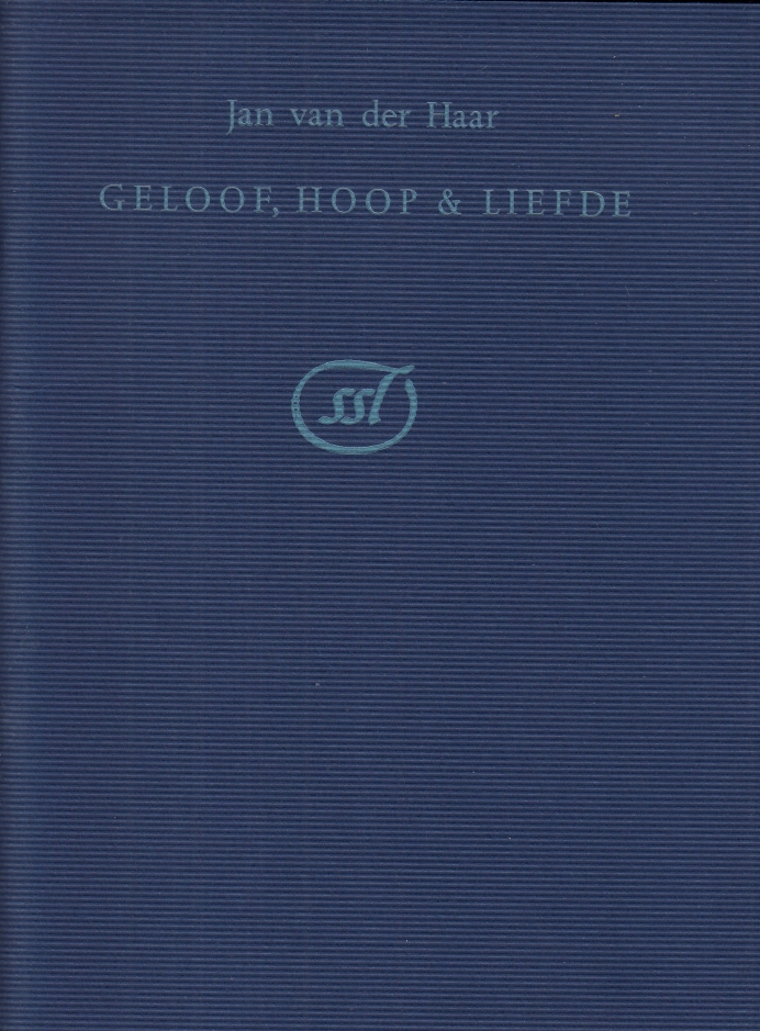 35. HAAR, Jan van der Geloof, hoop & liefde. Een sextine. Sub Signo Libelli, 2003. Ingenaaid met omslag. (12) p. Met de hand gezet en gedrukt op handgeschept papier in goud, rood en blauw in een oplage van 48 genummerde exemplaren. 1e druk.