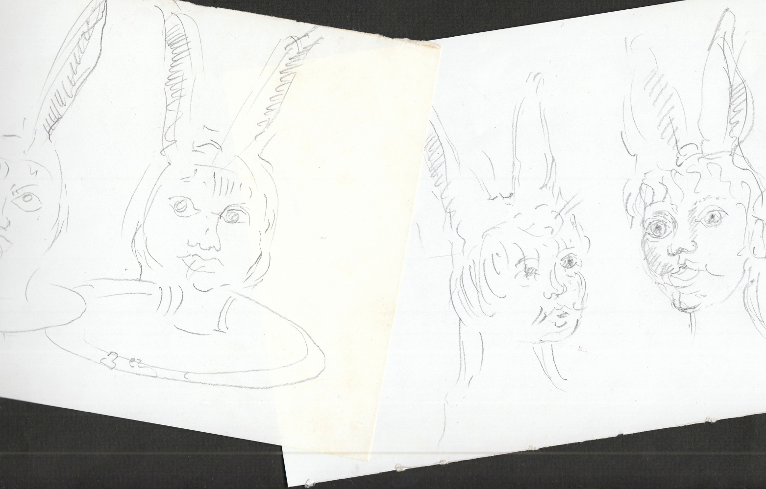 * Schetsmatige opzetjes voor de tekening op p. 30 van 22 sprookjes, verhalen en fabels (Amsterdam 1985). Het bijbehorende verhaaltje heet ‘Jagersleed’, dus misschien zijn het wel surrealistische portretjes van Bob en Tom.