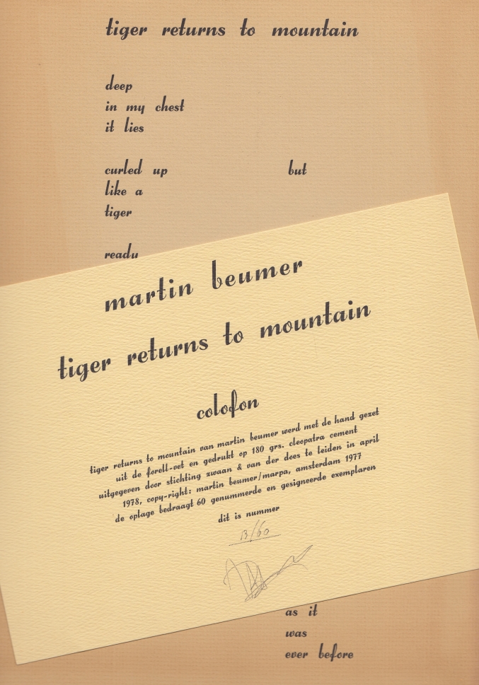 1. BEUMER, Martin Tiger returns to mountain. (Leiden, Zwaan & Van der Does, 1978). 32 x 22 cm. Plano. Met colofon op een apart blad (16 x 22 cm). Met de hand gezet uit de Forell-vet en gedrukt op 180 grams Cleopatra Cement in een oplage van 60 genummerde en gesigneerde exemplaren. 1e druk. Verkleurd.
