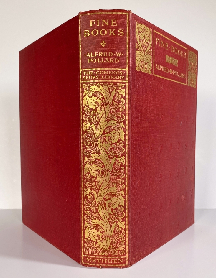 31. POLLARD, Alfred W. Fine Books. Londen, Methuen & Co. Ltd, 1912. 26 x 18 cm. Rijk verguld en blindgestempeld rood linnen. xvi, 332 p. Met 40 platen buiten de tekst, alle voorzien van een zijdepapieren beschermvelletje. Niet afgesneden. Met bibliografie en register. 1e druk. Enkele kleine watervlekken op de voorkant, scheurtje aan de voet van het overstekend ruglinnen, verder mooi en gaaf in al zijn weelderigheid van gewichtig, ruig, getint machinegeschept papier, fraai gedrukt.