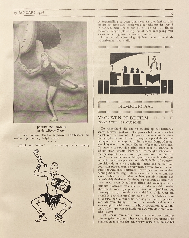 25. KOSTER, Simon, e.a. (red.) Spel en Dans. Maandblad voor tooneel, opera, dans en film. Amsterdam, Wereldbibliotheek, 1924-1926. 1e en 2e jaargang, 20 nummers (september 1924-september 1926). 31 x 24 cm. Gebonden in halflinnen met vuurrood gemarmerde platten. Zonder de omslagen. 228, (44); 190 p. Met veel foto’s en andere illustraties (een tweetal in kleuren). Vignetten van Jan Lavies. Achterin de eerste jaargang een overzicht van de dansleraren in Nederland, en er is een aantal geïllustreerde advertentiepagina’s en een paar van een programma voorziene reclamefolders meegebonden. 1e druk. Nette conditie.