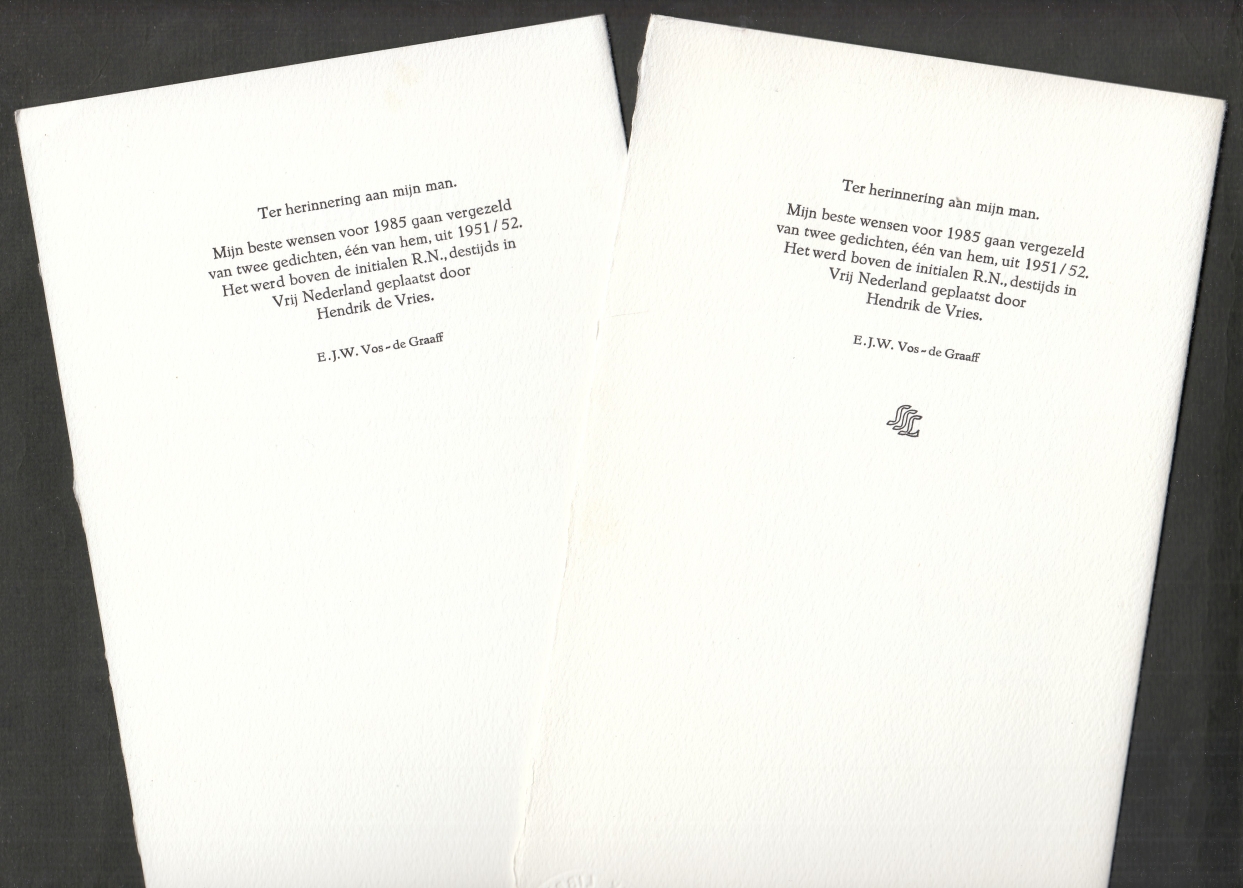 32. BOUTENS, P.C. e.a. Te verraden niet en niet te raden… [Utrecht], SSL, [1984]. 24 x 14 cm. Vouwblad van zwaar papier. Gedrukt voor E.J.W. Vos-de Graaff ter herdenking van haar overleden echtgenoot, H. Vos. Variant zonder het SSL-monogram onder het colofon.