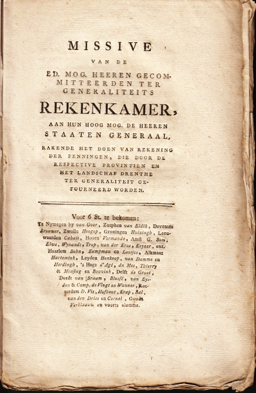 13. DRENTHE Missive van de Ed. Mogende Heeren Gecommitteerden ter Generaliteits Rekenkamer, aan Hun Hoog Mog. de Heeren Staaten Generaal, rakende het doen van rekening der penningen, die door de respective Provintien en het Landschap Drenthe ter Generaliteit gefourneerd worden. Nijmegen e.a., Van Goor e.a., [1787]. Eenvoudig blanco papieren omslag. 32 p. Ongeopend. Niet afgesneden. Goede staat.