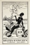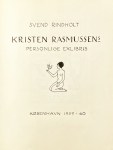 * Met inliggende handgeschreven brief in het Deens van Svend Rindholt aan ‘Kare Kristen’, gedateerd 7/2 1960. In 1970 verscheen een gedrukt boek van Rindholt over verzamelaar Rasmussens persoonlijke exlibris, wellicht met ongeveer dezelfde inhoud. Opvallend fraaie boekband. Rasmussen (1901-1984) was een groot verzamelaar en liefhebber van (al of niet erotische) exlibris.