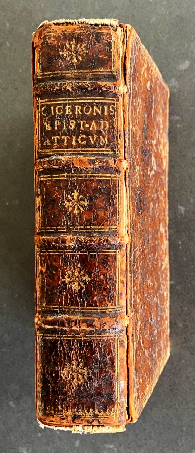 5. CICERO, Marcus Tullius Epistolarum ad Atticum libri XVI. Eiusdem epistolarum ad Q. fratrem, libri III. Incerti Auctoris epistola ad Octavium, non est enim Ciceronis. T. Pomponius Attici vita, per Cornelium Nepotem. Ex emendatione D. Lambini. (1579). Venetië, geen uitgever genoemd, 1579. Gemarmerd en gepolijst kalfsleer (17e-18e eeuw) met vier ribben en rugtitel. (4), 744, (4) p. Fraai houtgesneden drukkersmerk. Band wat versleten, in de knepen zijn de touwen zichtbaar. Achterop heeft in vroeger eeuwen een beker een vlek achtergelaten. Enkele 18e- of 19e-eeuwse nummertjes verwijzen naar oude bibliotheken. Naam van een vroeger eigenaar op titel in bleekrode inkt (‘Lohier’). In dezelfde kleur inkt zijn alle bladzijden, van 1-744, voorzien van netjes getrokken kaders die het tekstblok van de commentaren en de omgevende witte partijen en kopregels scheiden! Papier aan begin en eind iets verbruind. Hier en daar een wormgangetje in de marge.