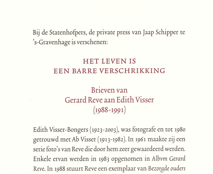 39. REVE, Gerard Het leven is een barre verschrikking. Brieven van Gerard Reve aan Edith Visser (1988-1991). Ingeleid en geannoteerd door Nop Maas. (Den Haag), Statenhofpers, 2009. Verguld linnen (Van Waarden). 80 p. Onafgesneden. Gedrukt in een oplage van 100 genummerde exemplaren. 1e druk.