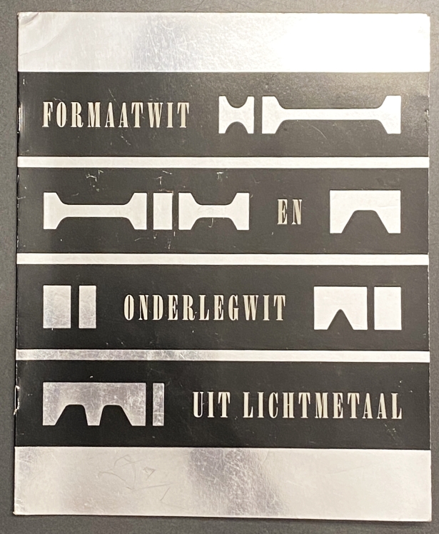34. LETTERGIETERIJ “AMSTERDAM” Formaatwit en onderlegwit uit lichtmetaal. Amsterdam, Lettergieterij ‘Amsterdam’, (ca. 1952?). 26,5 x 21 cm. Zilverkleurig omslag met zwart en wit, geniet. 12 p. Met foto’s en schema’s.