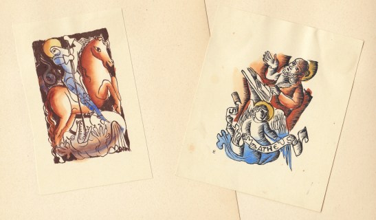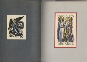 16. EYCK, Charles 14 heiligenprentjes. (Eigen beheer, 1932). 14 bladen met daarop geplakt evenzoveel met de hand gekleurde prentjes plus vouwblad in overslagmapje van zwaar geschept papier. 24 x 19 cm. Onder het colofon gesigneerd door Charles Eyck en door hem gedateerd ’25 Dec./ 1932′. Overslagmapje wat geschaafd aan de randen.