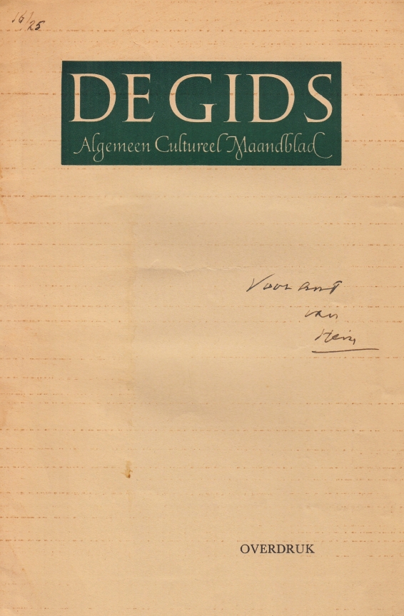 2. ‘Intermezzo voor A. Roland Holst. Een belangrijke gebeurtenis (1913)’. Ingeleid door G.H. ‘s-Gravesande. Overdruk uit De Gids, Roland Holst-nummer, 1958. Genummerd ’16/25′. Met voorop geschreven: ‘Voor Ant/ van/ Hein’.