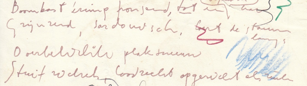 40. WOLKERS, Jan Sneeuwval. (Aanzet tot een gedicht). Decoratief handschrift in bruine viltstift. 12,3 x 19,9 cm. Met strepen en krullen in diverse kleuren potlood. Op de achterzijde in een ander handschrift twee boektitels van Jean Auel in potlood. Scheur. 8 regels.