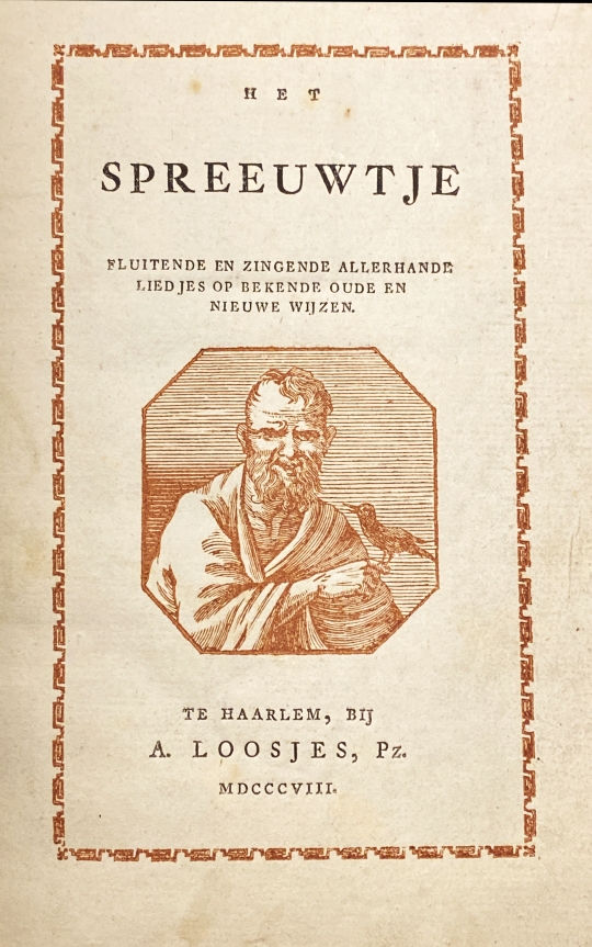 18. LIEDERBOEK Het spreeuwtje. Fluitende en zingende allerhande liedjes op bekende oude en nieuwe wijzen. Haarlem, A. Loosjes Pz., 1808. Ingenaaid met marmerpapier. (8), 80 p. Titelpagina in bruin en zwart, met titelprent. Eerste 8 pagina’s op lichtblauw papier gedrukt. Met register op eerste regels. 1e druk. Rug verstevigd met bruin linnen. Prima exemplaar.