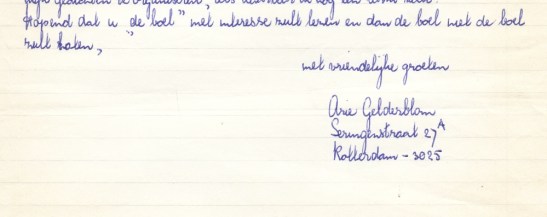 * De jonge dichter voelt zich door een bemoedigende brief gesterkt om ‘weer een aantal gedichten op te sturen’ en enkele korte verhalen. Hij haalt zijn recente boekje bij de Rotterdamse Kunststichting aan en ‘2 radio-uitzendingen’ om de redactie te overtuigen dat er belangstelling is voor zijn werk. ‘Hopend dat u “de boel” met interesse zult lezen en dan de boel niet de boel zult laten,/ met vriendelijke groeten’.