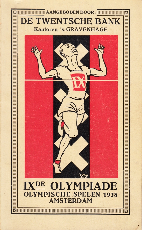 24. OLYMPISCHE SPELEN 1928 IXe Olympiade. Holland en de Olympische Spelen 1928 te Amsterdam. Officiëele uitgave van de Nederlandse Spoorwegen te Utrecht en de Algemeene Vereeniging voor Vreemdelingen-verkeer te Den Haag. Utrecht-Den Haag, NS / AVVV, 1928. 16,5 x 10 cm. Ingenaaid (omslagontwerp Peter Lutz). 80 p. Geïllustreerd. Boekblok los van omslag. Rug aan de bovenkant wat beschadigd. Enkele vage notities op de binnenkant van het omslag.