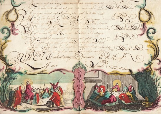 23. NIEUWJAARSWENS Nieuw Jaars Wens Aan Mijn Seer Veel Ge-eerde Neef En Nigt. Fraai gekalligrafeerde nieuwjaarswens van ‘WEds Onderdanige Dienaar En Neef Jan Smits’, gedateerd 1/1 1782. 41 x 32,5 cm. Op een vel papier met geëtste en handgekleurde sierrand met bijbelse taferelen (de Bergrede, de doop in de Jordaan, de intocht in Jerusalem en het Laatste Avondmaal), aangevuld met cornucopia’s en sierkrullen. Rechtsboven: ‘No. 30’. De kalligraaf heeft zich eveneens niet onbetuigd gelaten wat de sierkrullen betreft. Achterkant blanco. Tweemaal gevouwen. Klein gaatje in het midden. Papierranden iets verbruind.