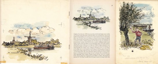 * Het betreft zeven (van de tien) illustraties voor het door de Rijkspostspaarbank uitgegeven jeugdboek Trekkend langs de waterwegen van K. van der Geest uit 1957. Een exemplaar van dit boekje is bijgeleverd. (Op het plaatje aan de linker- en rechterkant een aquarel, in het midden een pagina uit het gedrukte boek.)
