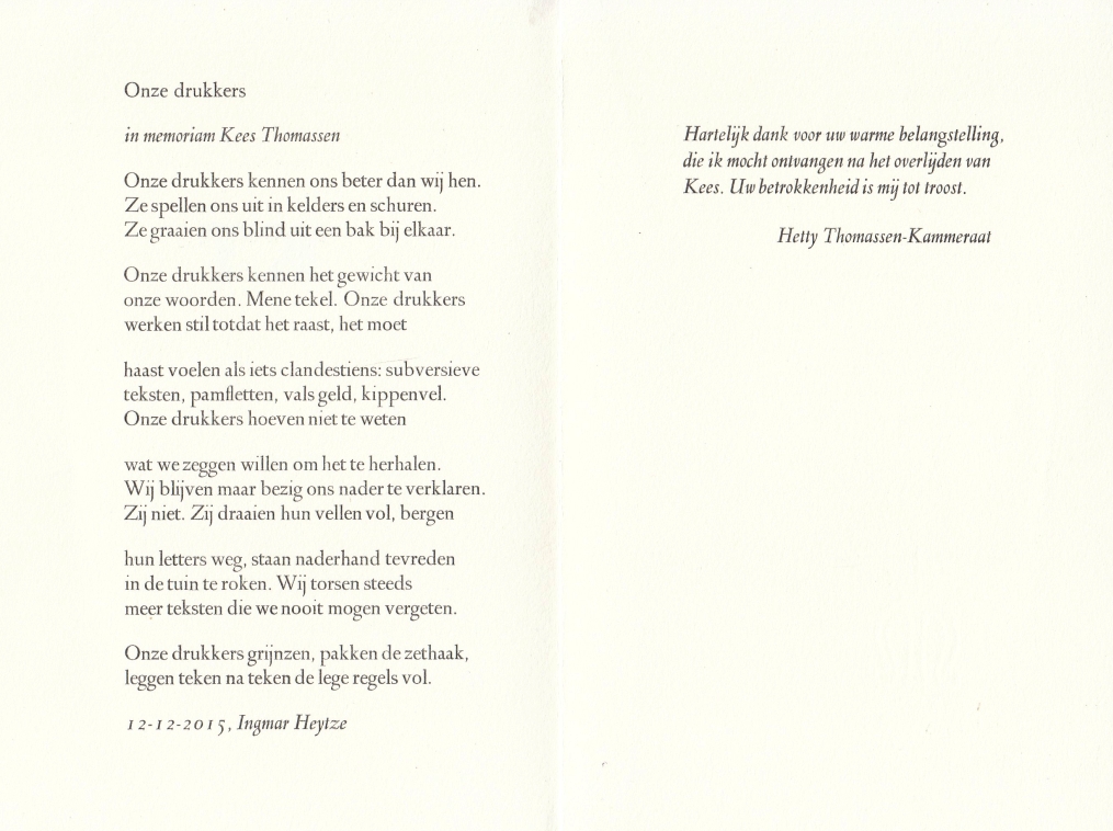 15. HEYTZE, Ingmar Onze drukkers. In memoriam Kees Thomassen. [Woubrugge?, Avalon Pers?, 2016?]. Vouwblad. Met de hand gezet en gedrukt in een beperkte oplage. 1e druk.