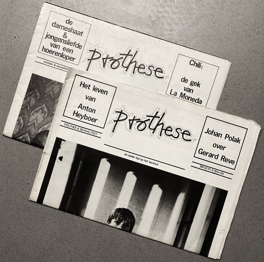 21. MOONEN, A. ‘De dameshaat & jongensliefde van een hoerenloper’. Interview met A. Moonen in Prothese. Uit zelfhaat geboren. Nr. 30 (1985). & ‘Jongensdons’, een verhaal van A. Moonen in Prothese nr. 42 (1986). Amsterdam, Stichting Zephyr, 1985-1986. 42 x 30 cm, 20 p. elk, los in elkaar geschoven. Lichte gebruikssporen.