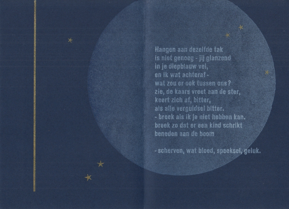34. SMIT, Wilfred Kerst. [Groningen], (Marlies Louwes, 1997). Vouwblad. Met de hand gezet en gedrukt in goud, wit en blauw op donkerblauw papier in een beperkte oplage.
