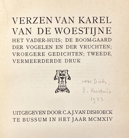 20. (MARSMAN, H.). WOESTIJNE, Karel van de Verzen van Karel van de Woestijne: Het vader-huis; de boom-gaard der vogelen en der vruchten; vroegere gedichten. Tweede vermeerderde druk. (Met opdracht van Hendrik Marsman aan Arthur Lehning). Bussum, C.A.J. van Dishoeck, 1914. Linnen. XVI, 270 p. 2e druk, vermeerderd met enkele ‘Vroegere Gedichten’. Rug bovenaan, onderaan en aan achterkneep beschadigd.