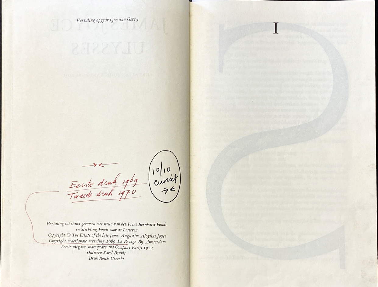 15. JOYCE, James Ulysses. Vertaling John Vandenbergh. (Correctie-exemplaar ten behoeve van de tweede druk). Amsterdam, De Bezige Bij, 1969. Linnen. 880 p. 1e druk.