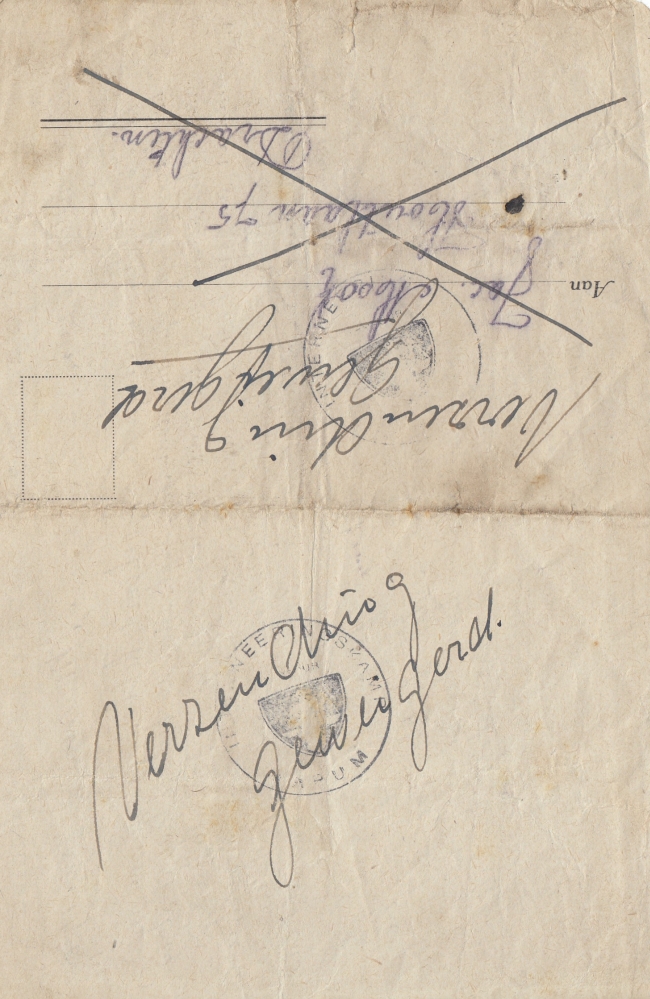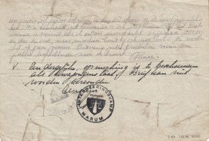 Met stempels en in inkt geschreven opmerking van een censor: ‘Een dergelijke opmerking [over de Leeuwarder commandant] is te beschouwen als kwajongenstaal. Brief kan niet worden verzonden. Censuur.’ ‘Verzending geweigerd’. De brief is dan ook geheel compleet inclusief het strookje dat voor de ‘antwoord envelloppe’ (sic) had moeten worden afgeknipt.