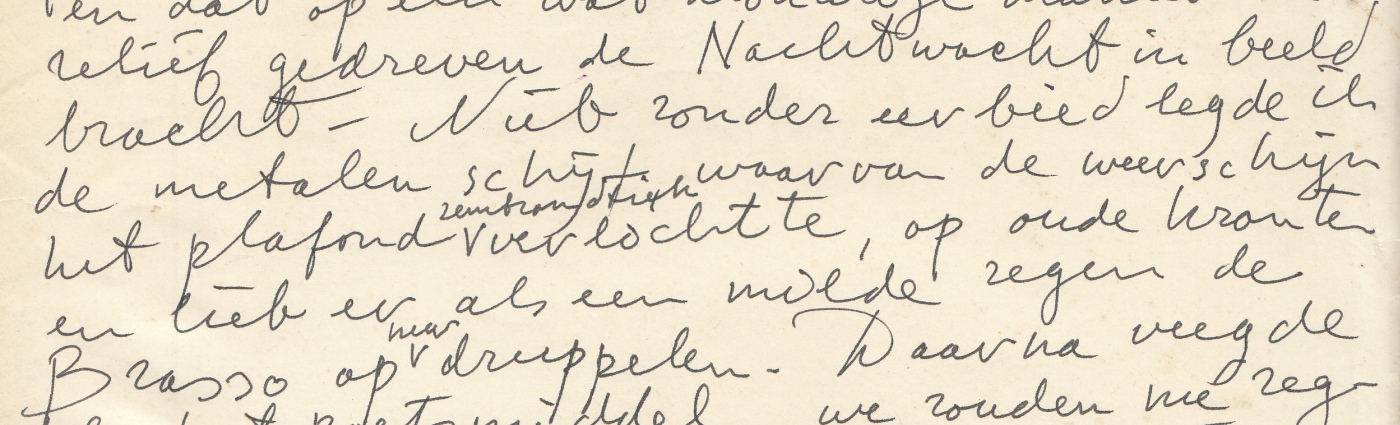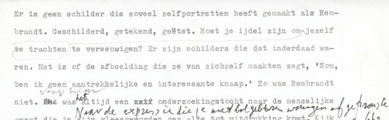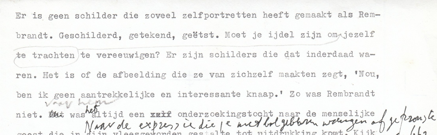 38. (REMBRANDT). WOLKERS, Jan (Vijf teksten uit De spiegel van Rembrandt). Typoscript. 5 bladen. Linksboven in potlood genummerd van 2 tot en met 6. Met enkele tientallen aanvullingen en correcties in potlood en inkt. . Getypt op de achterkanten van diverse fotokopieën.
