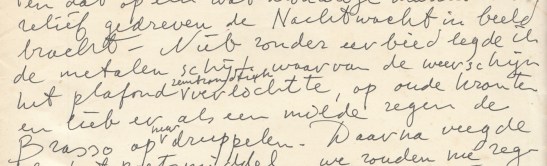 * Brief van een twintigjarige geïnterneerde voormalige NSB-er of SS-er aan zijn ouders. ‘Mijn eerste indrukken van dit kamp zijn heel goed.’ De man is tevreden, want hij kon al snel aan het werk bij een garage in Tolbert. Er is een commandant met wie je beter te doen kunt hebben dan met die van Leeuwarden: ‘die straalde gewoon het sardistische en hatelijke de ogen uit vooral als hij één van de SS tegenover zich zag’ (sic). Verder is het gezellig, er is een kantine met radio, een orgel en een accordeon. Hij doet groeten aan allerlei vrienden.