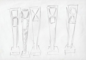 Op deze schetsen staat de vorm van het monument al vast, maar op de compartimenten wordt vijfmaal gevarieerd.
