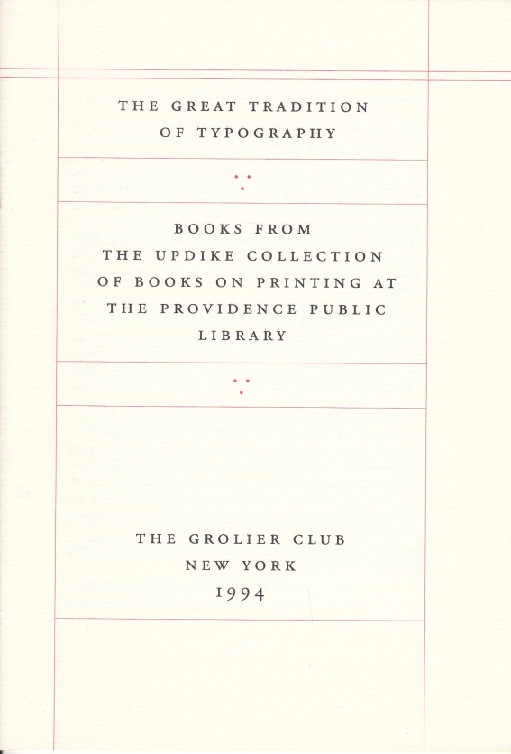 43. (UPDIKE, D.B.). WEIMERSKIRCH, Philip, & Kimball HIGGS The Great Tradition of Typography: Books from the Updike Collection of Books on Printing at the Providence Public Library. New York, The Grolier Club, 1994. 18 x 12 cm. Geniet. 16 p. incl. omslag. Inleiding van Weimerskirch en Higg, gevolgd door een bibliografie. Gezet uit de Adobe Garamond en gedrukt in oranje en zwart in 1100 exemplaren. Met inliggend visitekaartje van Philip Weimerskirch en een kopie van diens toespraak bij de opening van de tentoonstelling.
