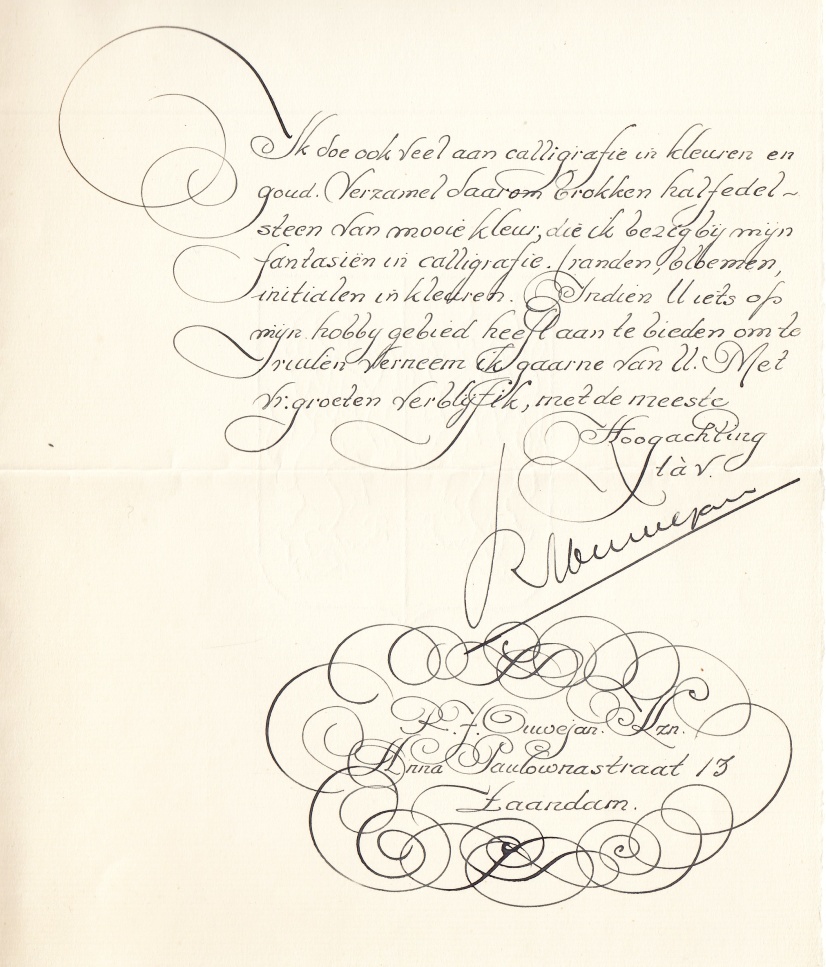 8. (COLLECTIE R.M. NIJHOFF). OUWEJAN Kzn, R.J. Gecalligrafeerde brief aan de verzamelaar R.M. Nijhoff te Wijk bij Duurstede. Gevouwen blad geschept papier met watermerk ‘Gelria’ en wapen van Gelderland, beschreven op p. 1 en 3 in rijkelijk krullende kalligrafie, gedateerd ‘Zaandam, 6/3 A.D. 1953’. 21 regels. Gesigneerd ‘R.J. Ouwejan Kzn.’ met adres te Zaandam.