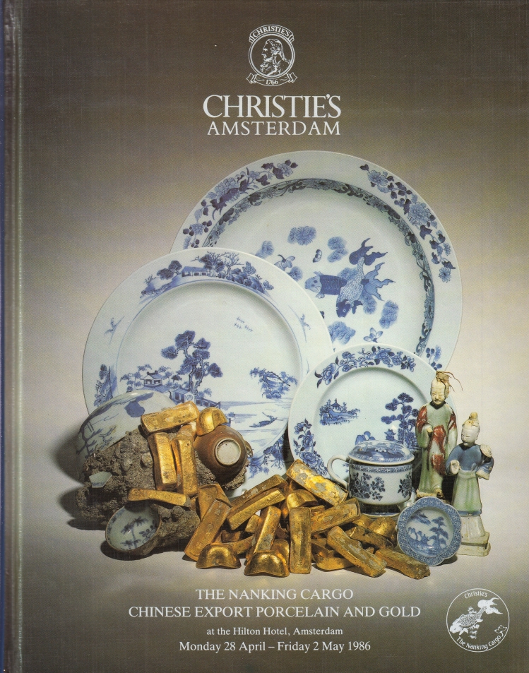 14. HATCHER, Michael The Nanking Cargo Chinese Export Porcelain and Gold. European Glass and Stoneware. Recovered by Captain Michael Hatcher from a European merchant ship wrecked in the South China Seas. Amsterdam, Christie’s, 1986. 26 x 20 cm. Karton met fotografie. 278 p. Rijk geïllustreerd. Met 2 inliggende bijlagen ‘Additional lots’ (4 p. en 16 p.) en losse opbrengstenlijst. 1e druk. Inscriptie op schutblad. Zeer gaaf.