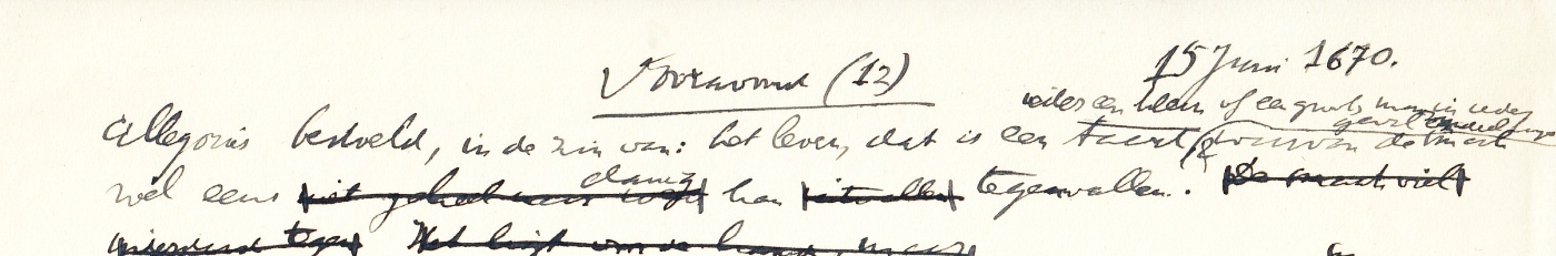 – Doorslag van een getypte brief van Mr. G.J.H. de Leeuw (een advocaat en voormalig gemeenteraadslid te Haarlem) met tientallen commentaren op de eerste tien pagina’s van Vandenberghs vertaling. Gedateerd 30 maart 1971. Drie bladen.