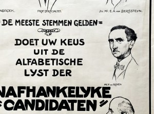 41. (ROYEN, J.F. van). SLUITER, Willy Doet uw keus uit de alfabetische lijst der Onafhankelijke Candidaten. 1922. Grote verkiezingsposter (111 x 80 cm). Lithografie in zwart op wit papier. Met getekende portretten van Catharina van Tussenbroek, prof. R.H. Saltet, Jhr. Mr. E.A. van Beresteyn, Mr. J.F. van Royen, Dr. J. van Leeuwen, Dr. E. Bonebakker, Dr. Jan Kalf, Dr. H.G. van Wijngaarden en J.G. Moojen. Van de bekende uitgever Lion Simons tekende Willy Sluiter geen portret, maar een opengeslagen boek met de tekst ‘Wereldbibliotheek/ Elk ’t Beste’. Met rijmpje: Hier stemt men niét op nummer of op lijst / Zooals ’t partijbestuur U wijst / Maar kiest men vrouw of man / Die ’t Volksbelang het best verzorgen kan. Enkele randkreukjes en reparaties, maar als geheel in goede staat.