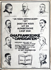 Bij de Tweede-Kamerverkiezingen van juli 1922 behaalden de Onafhankelijken echter niet meer dan 0,54% van het aantal stemmen, veel te weinig voor een van de 75 Kamerzetels. Deze grote affiche is een schier onvindbaar document! Sommige van de portretten zijn wel beken, want apart gepubliceerd, maar van deze verkiezingsprent kon ik geen exemplaar in de archieven vinden.