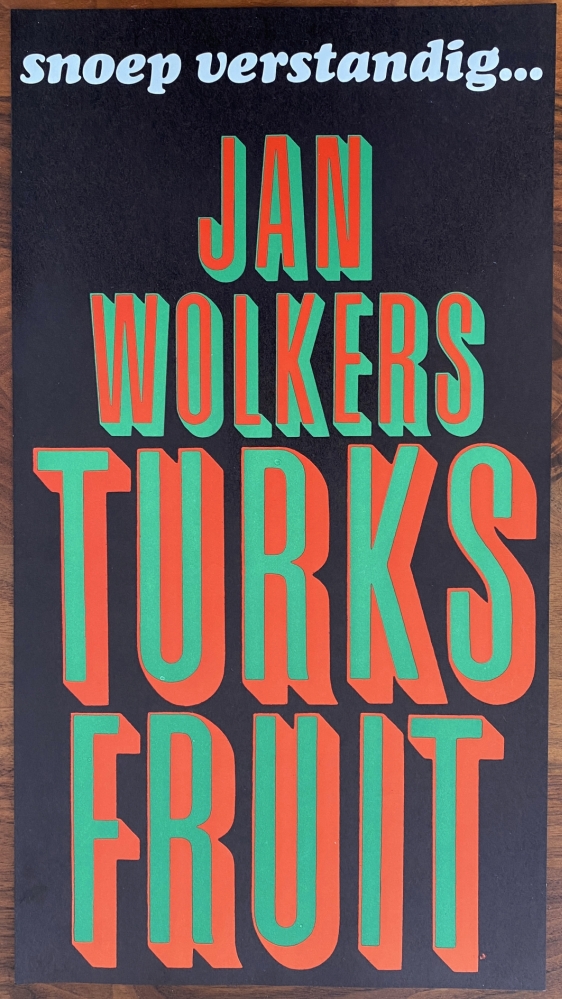 33. WOLKERS, Jan Snoep verstandig! Turks fruit. (Affiche). 45,5 x 25 cm. Eenzijdig bedrukt in rood, groen en zwart. 1969. Mooi exemplaar.