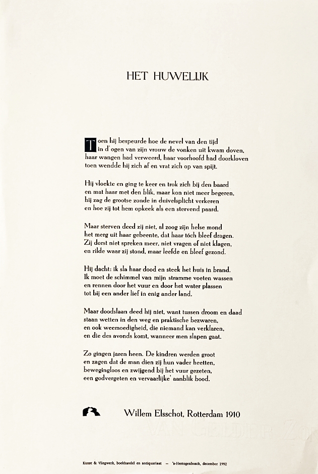 11. ELSSCHOT, Willem Het huwelijk. Den Bosch, Kunst & Vliegwerk, 1992. Rijmprent. 39,3 x 27,0 cm. Gedrukt in blauw en zwart op Van Gelder-papier. Klein scheurtje.