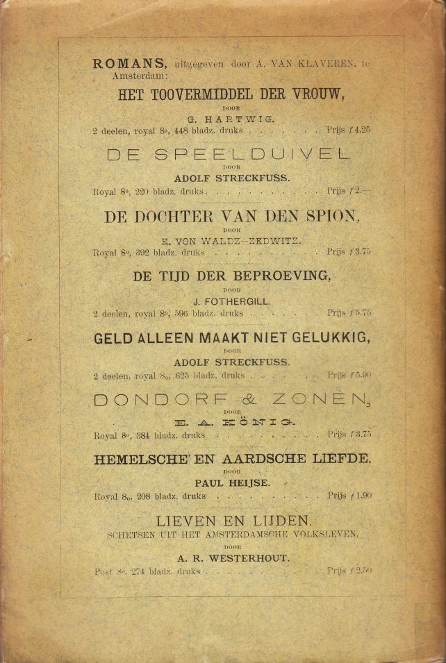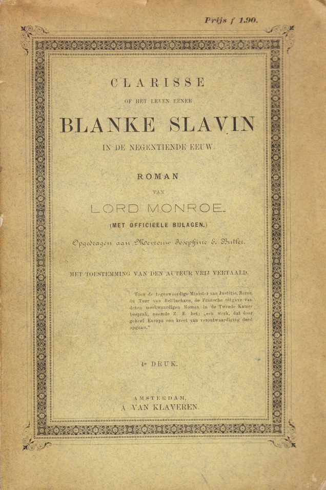* Over een in Brussel tot prostitutie gedwongen Engelse vrouw. In feite een vertaling van het Franstalige boek La Clarisse du XIXe siècle ou la traite des blanches. ‘Lord Monroe’ is een pseudoniem van de Brusselse advocaat (en gemeenteraadslid) Alexis Splingard. De eerste Franse druk van deze aanklachtroman verscheen in 1882. Jaartal van deze 4e druk afgeleid uit krantenadvertenties. Voorin (3 p.) en op de achterkant lange lijsten met de populaire en sensationele publicaties van Van Klaveren.