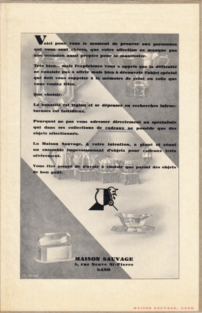 20. (LEONARD, Jos). MAISON SAUVAGE GAND (Handelscatalogus). Brussel, Studio Novio, 1927. 22 x 14 cm. Origineel zwart mapje waarop een etiketje, in goud en rood bedrukt: een hand met juwelen. 6 bladen stevig papier met één doorzichtig omslag, in het Frans bedrukt (letter: Sphynx van Deberny & Peignot). Afbeeldingen van servies, zilver en juwelen. Zeer gaaf.