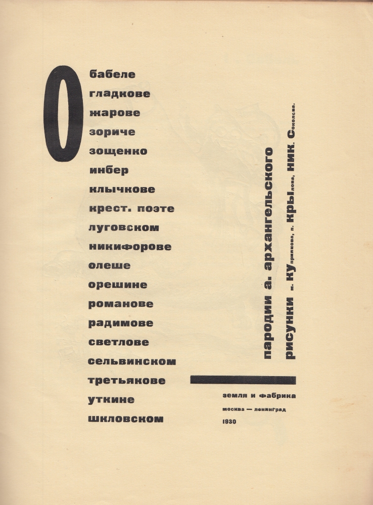16. KUKRYNIKSY & A. ARCHANGELSKY Parodies on Babel, Gladkow, Zoshtchenko, Kluchkov, Olyesha, The Peasant Poet, Tretyakov, Utkin, Shklovsky a.o. Moscow-Leningrad, Zemlya i Fabrika, 1930. 30 x 22 cm. Original illustrated wrappers. 48 p. Poems by Archangelsky, caricatures by the Kukryniksy collective, book design Solomon Telingater. 1st edition. Cover waterstained at the lower edges. Some typical Russian traces of use.