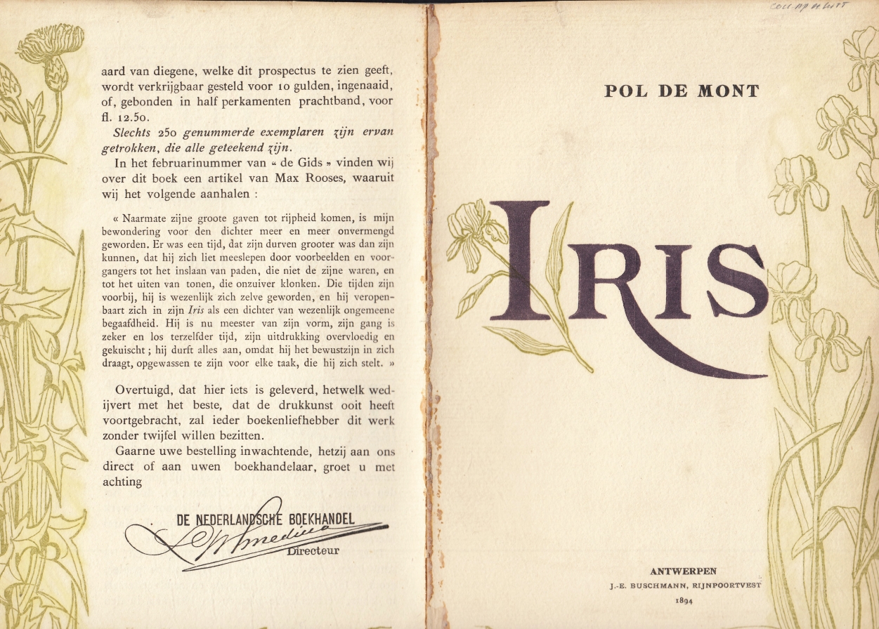 24. MONT, Pol De Iris. (Prospectus). Antwerpen, Buschmann, 1894. 23 x 16 cm. Vouwblad. Met op alle bladzijden een bloemenrand in groen, wellicht van de hand van Paul Buschmann. Plakrandje op de vouw.