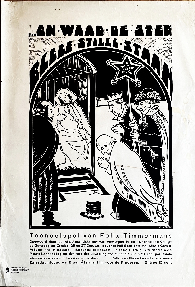 30. TIMMERMANS, Felix En waar de ster bleef stille staan… Tooneelspel van Felix Timmermans. [Roosendaal], Katholieke Kring, [1931]. 90 x 63 cm. Zwartwit-linoleumsnede in groot formaat door J. Couwenbergh. Gedrukt door Grafische Kunstinrichting J. van Poll Suykerbuyk te Roosendaal. 1e druk. Wat kreukjes en vlekjes, maar toch vrij gaaf.
