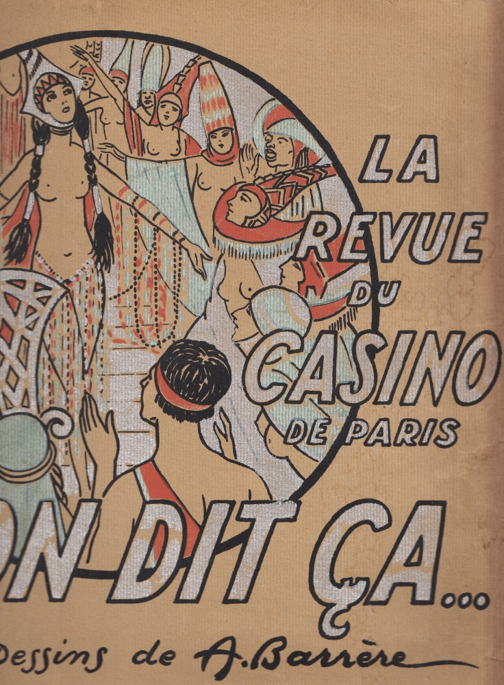 1. BARRÈRE, Adrien La Revue du Casino de Paris. On dit ça. Dessins de A. Barrère. 1e et 2e versions. Paris, Casino de Paris, c.1925. 32 x 24 cm. Grote leporello van 12 p. rijk in kleuren bedrukt. 1e druk. Zoals altijd is de omslag van deze tere uitgave versleten aan de randen en losgeraakt. De leporello is op de vouwen wat sleets, en we hebben wat roest op het eerste blad en hier en daar een randscheurtje.