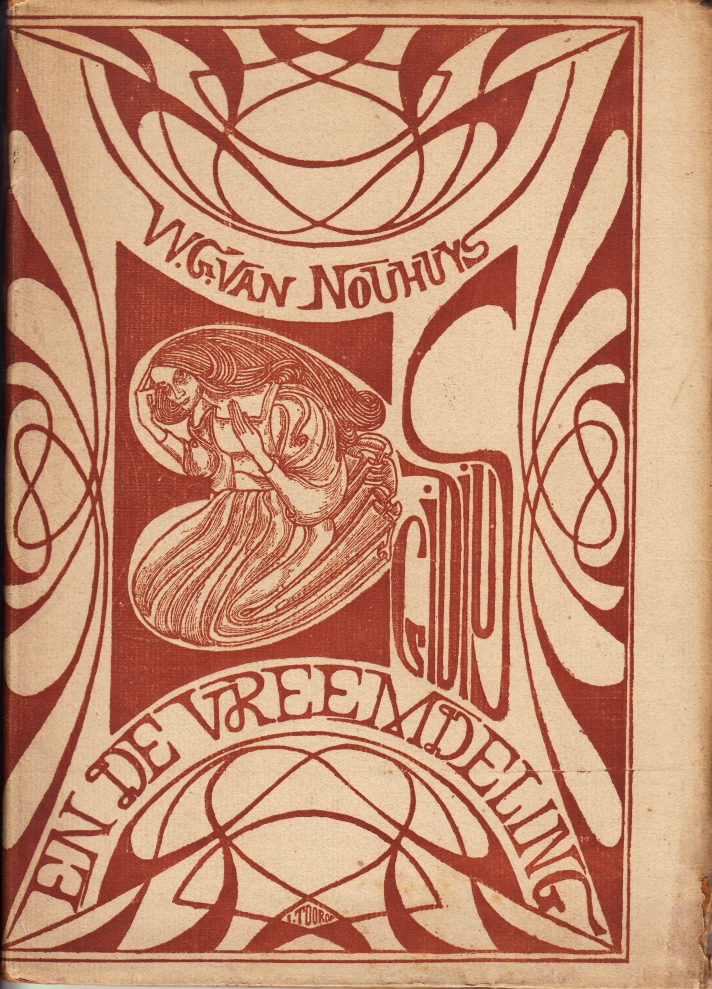 31. (TOOROP, Jan). NOUHUYS, W.G. van Egidius en de vreemdeling. Met portret van den schrijver en illustrates van J.Th. Toorop. Haarlem, Erven Bohn, 1899. Ingenaaid met ontwerp van Toorop in bruinrood over voor- en achterzijde. (6), 46 p. Behalve het portret zijn er twee prenten van Toorop buiten de tekst. 1e druk. De omslagtekening van Toorop is geheel gaaf, al is het omslag daarbuiten heel licht gehavend: boven- en onderaan de rug en de rechteronderhoek is wat verbrokkeld. Boekblok bijna los.