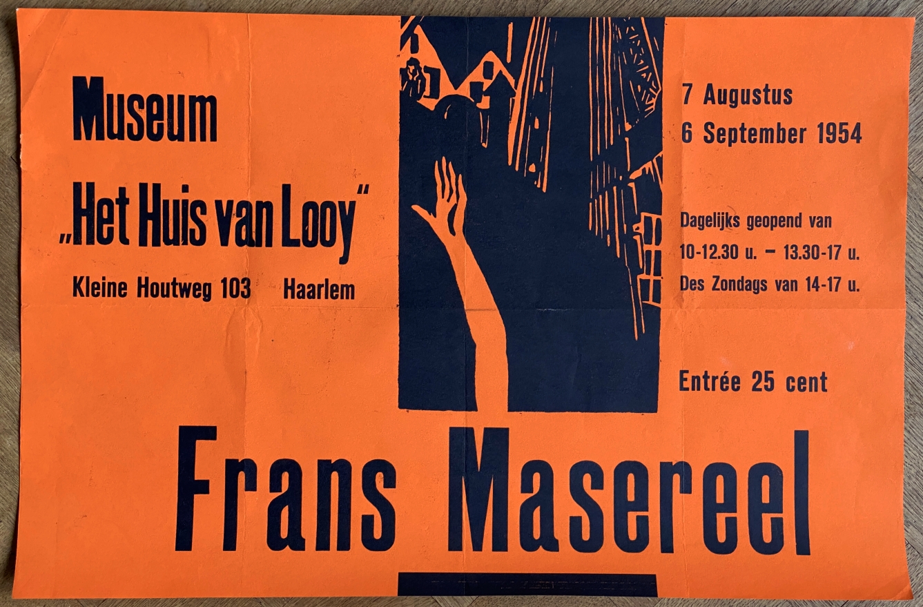 22. MASEREEL, Frans Museum ‘Het Huis van Looy’, Haarlem: Frans Masereel 7 Augustus-6 September 1954. (Poster). Oranje blad, 41 x 62 cm, liggend formaat. Met afbeelding van een linosnede van Masereel. Aan de achterkant adressering met postzegel van 2 cent: ‘Aan de Weled. Hr Dir. v.d. N.V. G.H. Bührmann/ Prinsengracht 28-46/ Amsterdam’. Gevouwen. Uitstekende staat.
