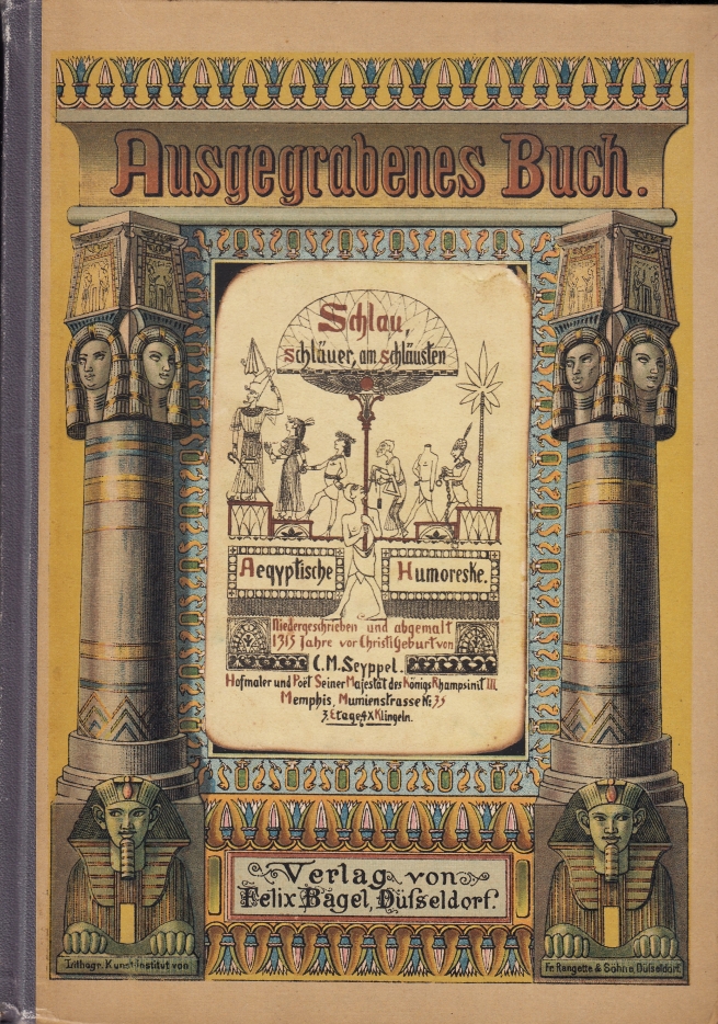 * Die knotsgekke farao’s met hun potsierlijke piramiden! Dit boek doet alsof het een originele grafvondst is van Schotse archeologen in Gizeh (1882), na 3000 jaar onder het zand van de Egyptische woestijn. Het is gedrukt op dik, zandkleurig papier dat op papyrus lijkt (omsloten door prachtig gelithografeerde, stevige platten) en vertelt een romantisch verhaal over een fictieve farao van de 20e dynastie, geïnspireerd op Herodotus’ verhaal over de Meesterdief. Opgedragen aan Wilhelm Schliemann in een inleiding van 4 p. Geïnspireerd door de grote ontdekkingen van de archeologie (onder andere door Schliemann) in de negentiende eeuw. Een humoristisch Duits boek!
