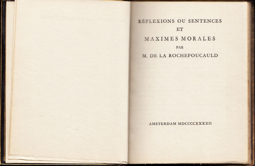 23. LA ROCHEFOUCAULD, François de Réflexions ou sentences et maximes morales. (Met luxe band). Amsterdam, (A.A. Balkema), 1942 [= 1944]. 13 x 10 cm. Gebonden in gepolijst kalfsleer met rugtitel en vergulde kaders aan de binnenkant (met stempel van J. Brandt & Zoon), oorspronkelijke voorzijde omslag meegebonden. (94) p. Gezet uit de Garamond en gedrukt op grijsgetint Pannekoek in een oplage van 200 exemplaren. 1e druk. Ruggetje wat versleten, leer is niet helemaal fris, het heeft een grijze zweem. Met voorin een monogramstempel CL of LC en achterin een wapenstempeltje met Nederlandse Leeuw en koningin Emma (? zie afb.). Uit de illegalenverzameling van A.J. Eschauzier met diens notitiepapiertje.