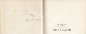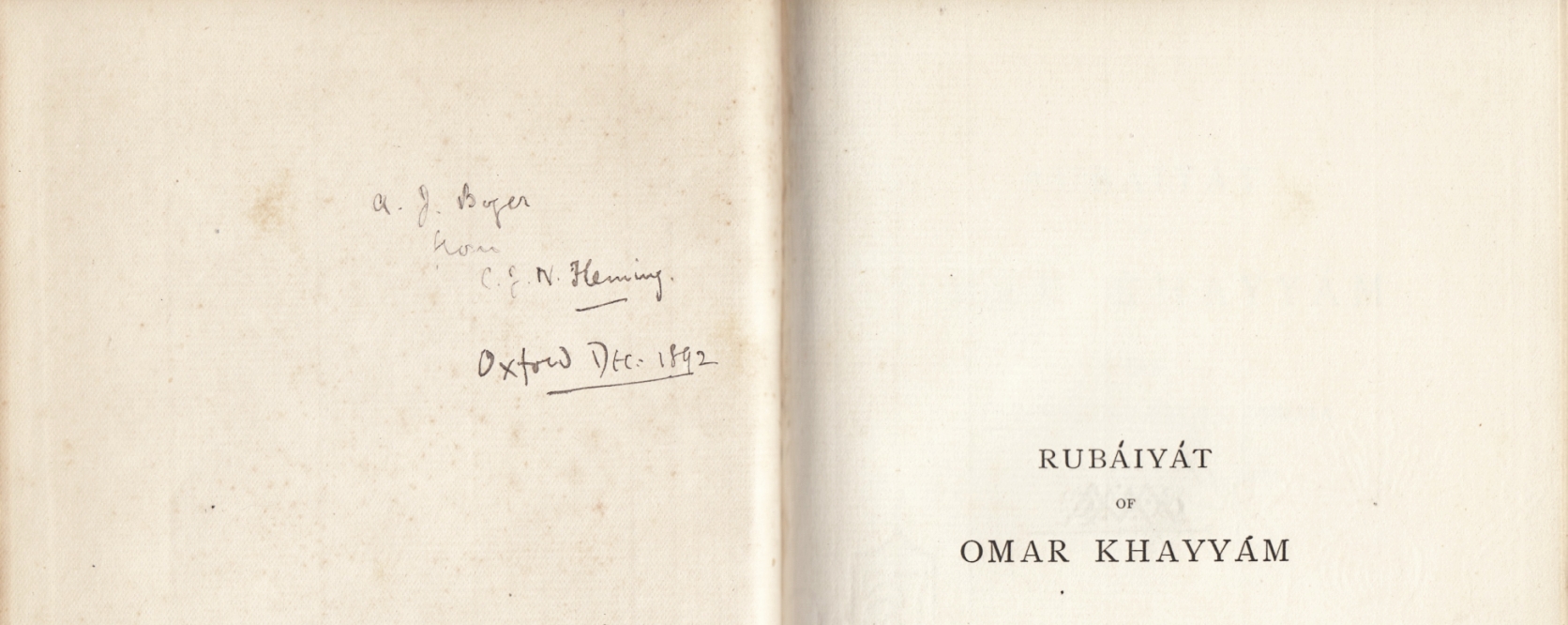 29. OMAR KHAYYAM Rubáiyát of Omar Khayyám, the Astronomer-Poet of Persia, Rendered Into English Verse. London, Macmillan & Co., 1891. Origineel perkament met gouden lijnen. (4), 112 p. Niet afgesneden. Herdruk. Perkament wat donker, schutbladen verbruind, verder heel mooi en ongevlekt. Met opdracht van C.J.N. Fleming aan A.J. Boger, ‘Oxford Dec. 1892’.